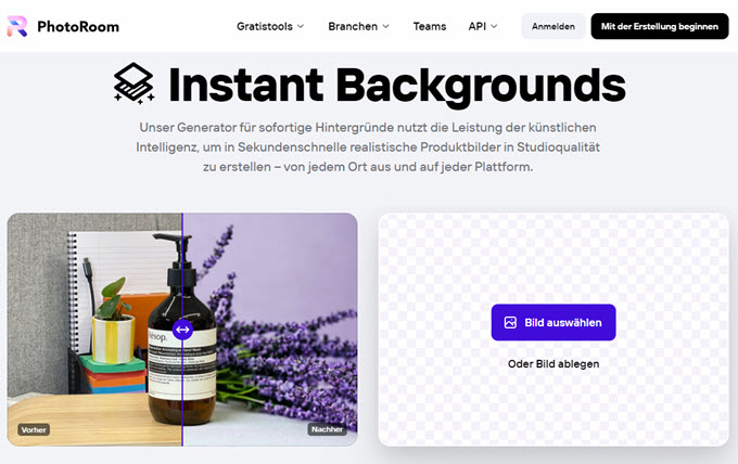 Photoroom ist ein KI-Hintergrund-Generator, der realistische Bildhintergründe in Sekundenschnelle erstellt. Er bietet einen einfachen Prozess zum Erstellen eines sofortigen Hintergrunds. Benutzer müssen nur beliebige Bilder hochladen, und es wird sofort einen Hintergrund erstellen. Photoroom betont die Verwendung von Hintergründen für Produktfotos. Die KI-Algorithmen können das Bildmotiv erkennen und sich anpassen. Dadurch generiert er einen Hintergrund, der zur Beleuchtung des Produktfotos passt.